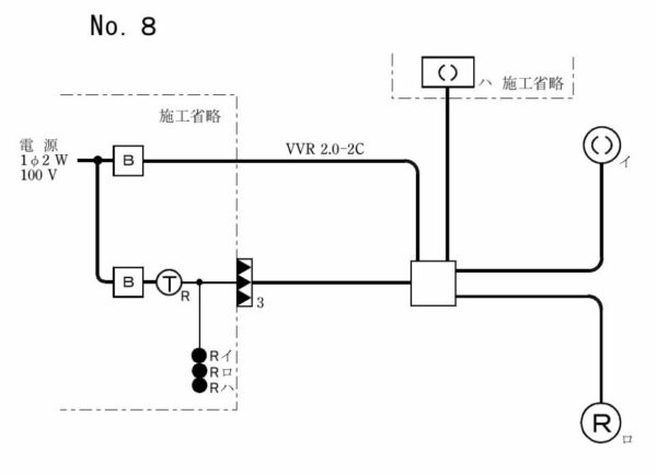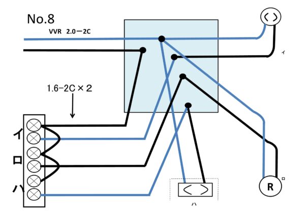 現在(2025年度)のNO8は「ハ」とリモコンリレーの配置が変わっておりますが、結線内容は同じになっており、やはりリモコンリレーの部分に使用する電線の種類は記載されていません。