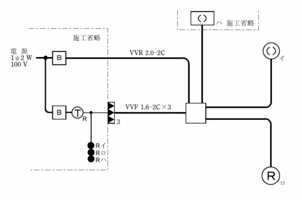 今の形とは「ハ」の位置が違うもののリモコンリレーに使用する電線はVVF1.6-2C×3となっております。ですから試験でも別想定を考える必要はなく、1.6-2Cを3本使用して作成していました。