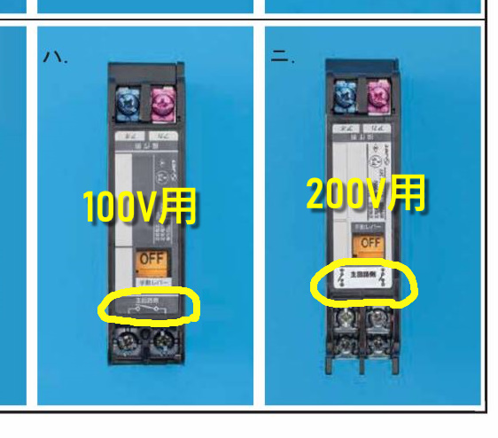 黄色いマークを付けた部分に200v用となっていることが分かるかもしれません。100V側はスイッチで言うところの片切スイッチですが、200v用は両切りスイッチになっているのが分かるかもしれませんね。