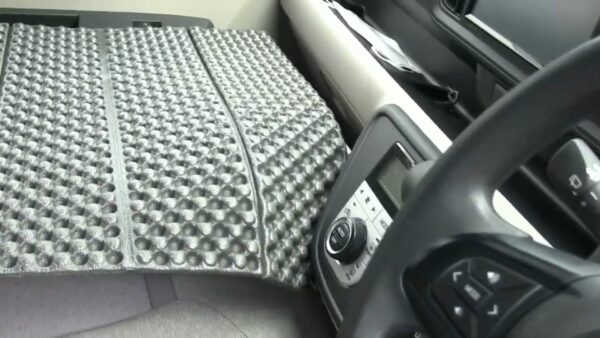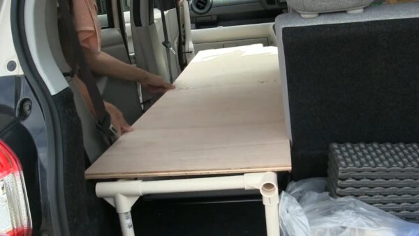 運転席側もパイプやジョイントで板を使うと収納部分がなくなり大掛かりになってしまうので別の方法でフラット状態を作ります。最初に後部座席の一つを取り外しましたのでそれを活用します。