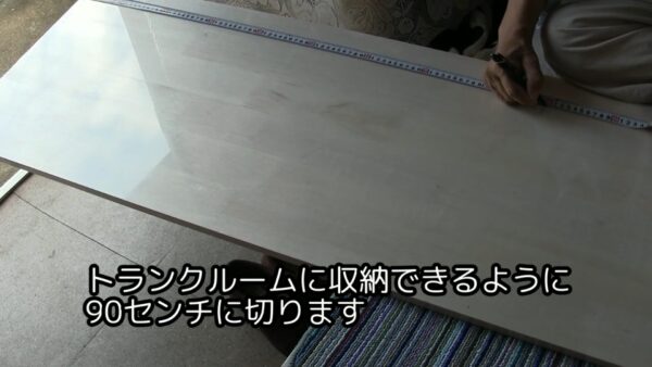 まずはベッドになる部分の板の加工です。長さ180せんちの集成材を半分にして蝶番で折りたためるようにしてトランクルームに収納できるサイズにします。出来上がった板を収納できるかやってみました