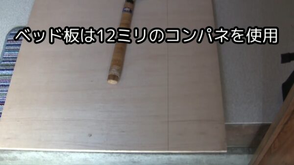 これは180センチのコンパネを半分にした後蝶番でつないであるものです。これでフラットの床状態のベッドができました。これにマットを敷いていきます。